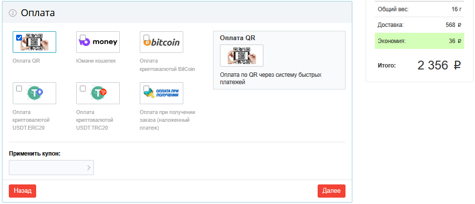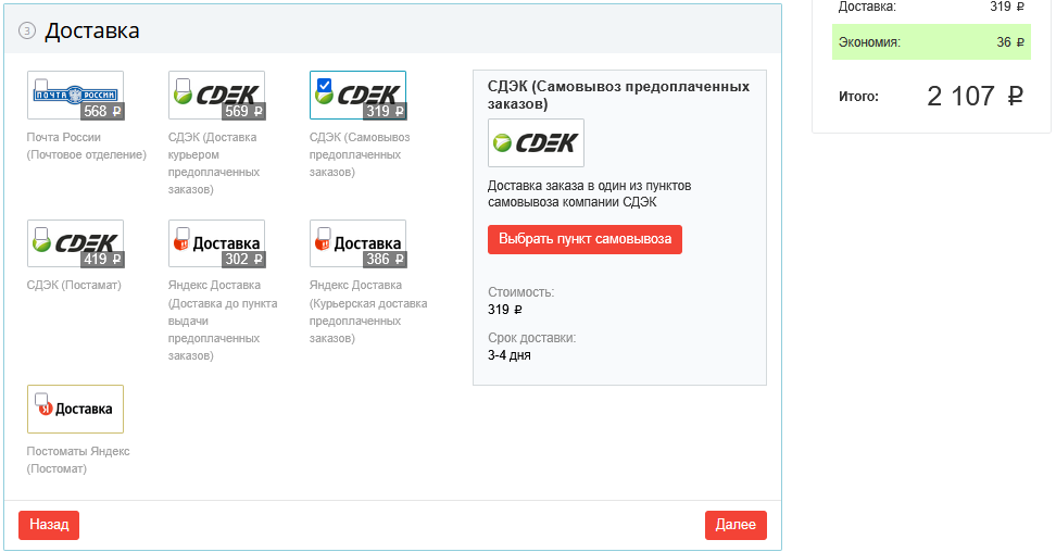 Теперь выбираете способ доставки, например, очень оперативный и надежный - СДЭК.